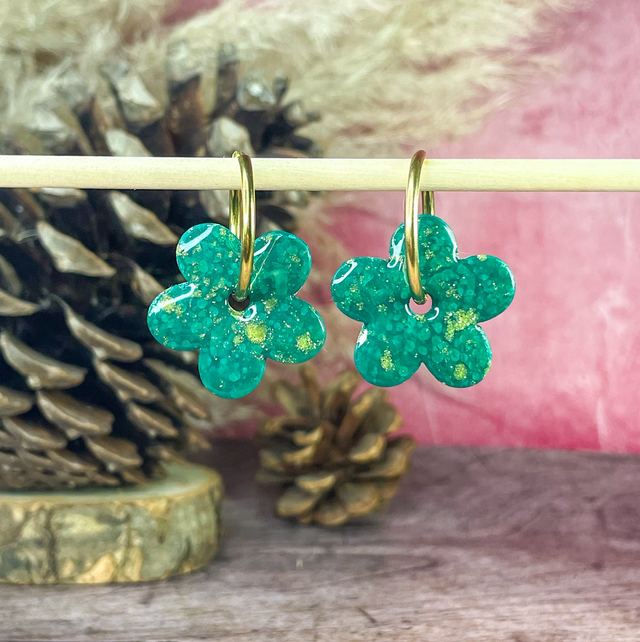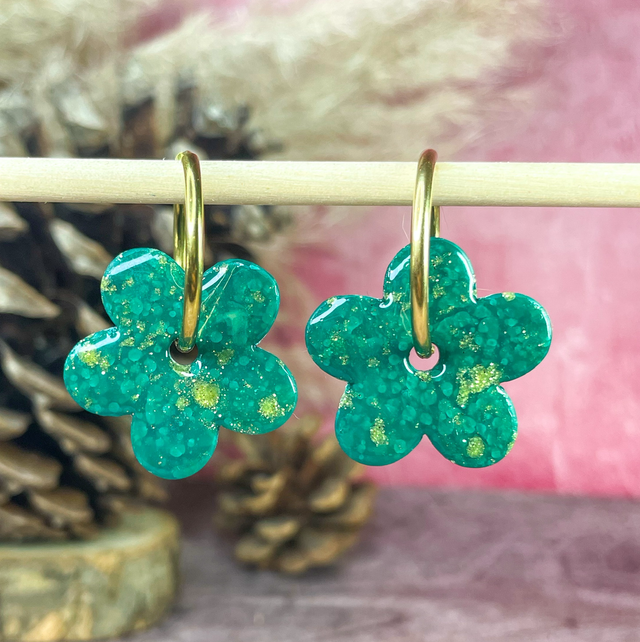 Maxi fleurs - Vert impérial & éclats doré (sans créoles)
